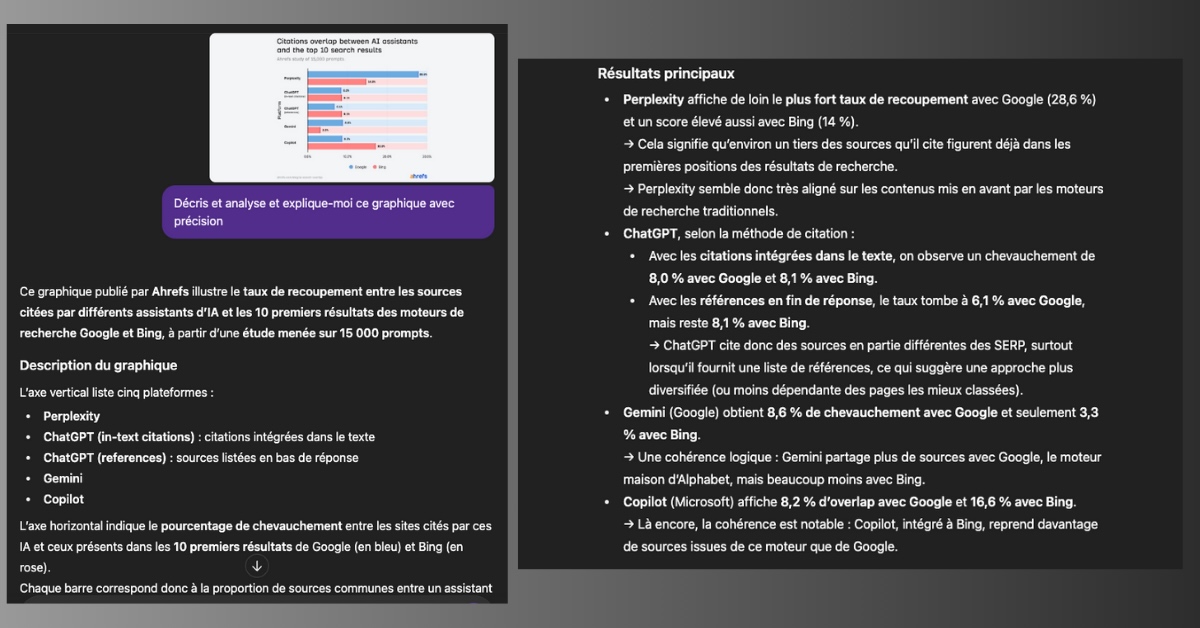 Ce n’est pas vers Perplexity qu’on se tournerait naturellement pour analyser une image. Conçu comme un moteur de recherche par IA, l’outil peut néanmoins réaliser les mêmes tâches que ces concurrents. Aussi bien ? Cela dépend des cas. Lors de nos tests, Perplexity a montré ses capacités à bien suivre nos consignes, en répondant à nos demandes spécifiques. Il n’a aucun problème à détecter l’interface Discord et donner le bon chemin. Il comprend et décrit avec les bonnes données le graphique d’Ahrefs, avec une structure qui répond parfaitement au prompt : description, analyse, explication.