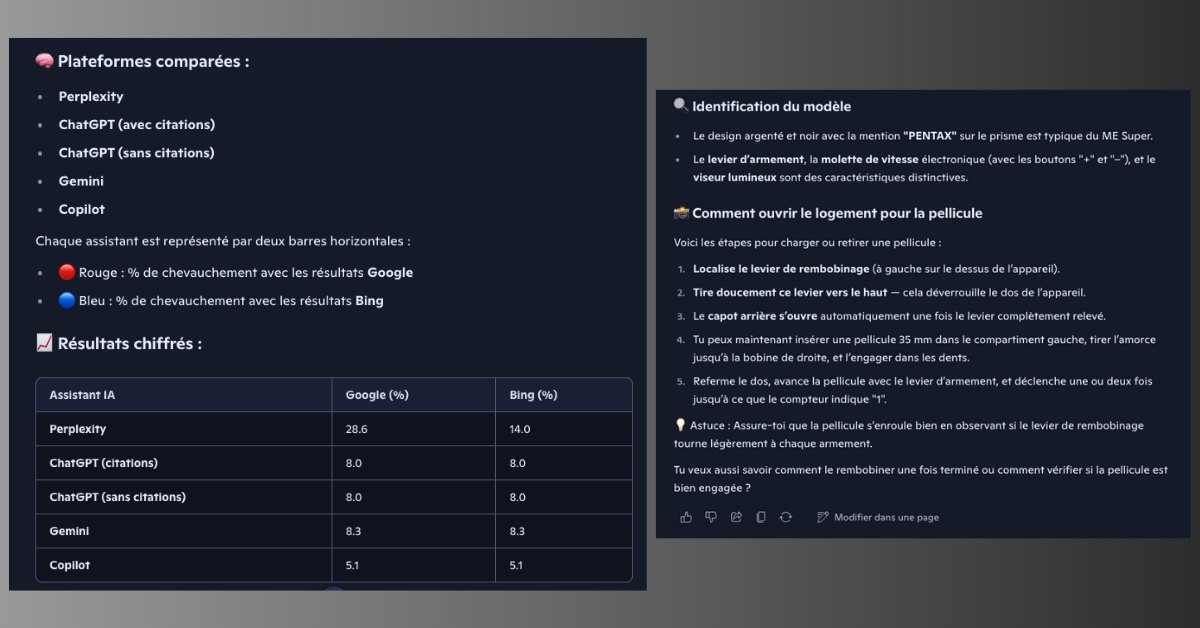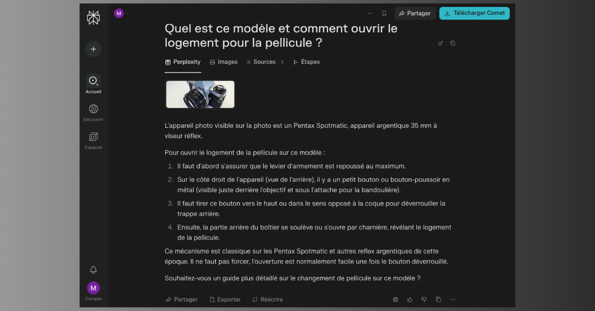 Les réponses sont concises mais assez précises. On peut cependant regretter que l’analyse du graphique soit un peu orientée, avec une certaine mise en avant de… Perplexity. Enfin, du côté de l’analyse et du conseil pour l’appareil photo, l’outil a tout faux : il se trompe de modèle mais également dans son mode d’emploi pour ouvrir le compartiment pellicule.