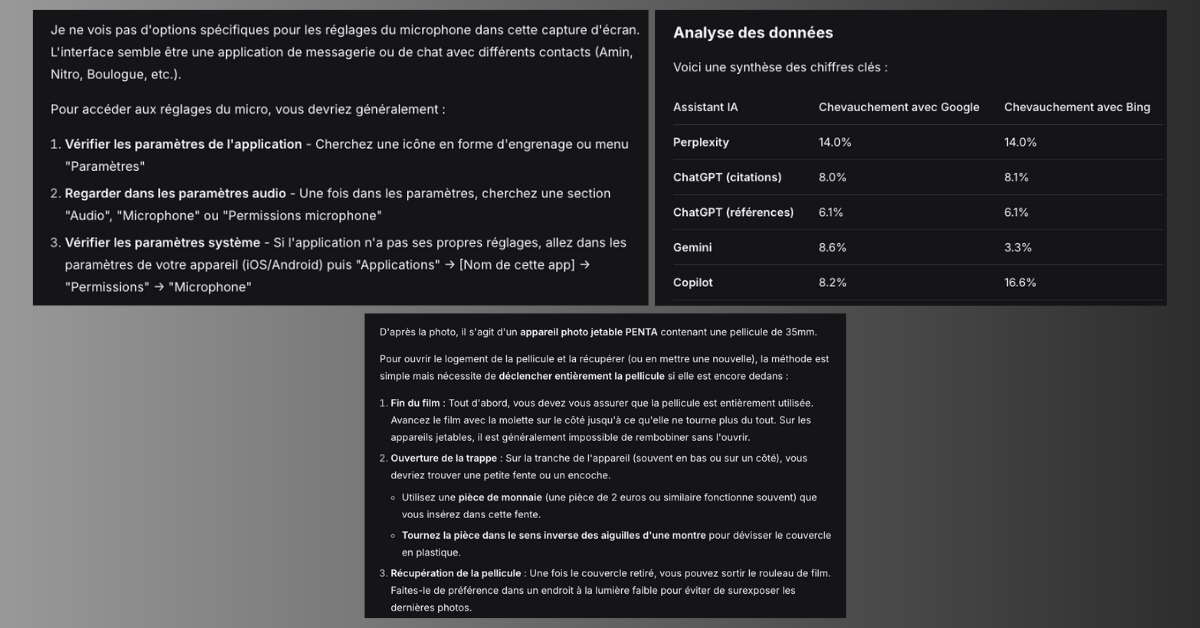 Les outils d’IA proposés par Microsoft sont souvent critiqués, pourtant, cette expérience d’analyse d’images a réellement été une relativement bonne surprise. Copilot a parfaitement détecté l’interface Discord, compris le graphique d’Ahrefs et est le seul modèle testé à donner la bonne référence de l’appareil photo. Côté pertinence des réponses, pas grand-chose à signaler pour l’aspect procédure/mode d’emploi. On trouvera sans problème les réglages micro sur Discord ou la manipulation pour ouvrir le boîtier pellicule.