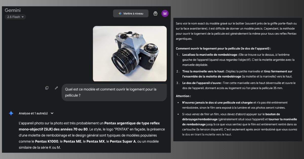 - Une photo d’un Pentax ME Super avec le prompt suivant : « Quel est ce modèle et comment ouvrir le logement de la pellicule ? »