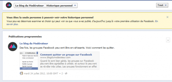 Comme souvent dans ce genre de cas, la solution est simple, mais le tout est de la connaitre. Vos messages programmés sont visibles dans l’onglet Modifier la page > Utiliser l’historique. Vous pourrez les supprimer ou les modifier directement depuis cette page. Vous voilà sauvé !