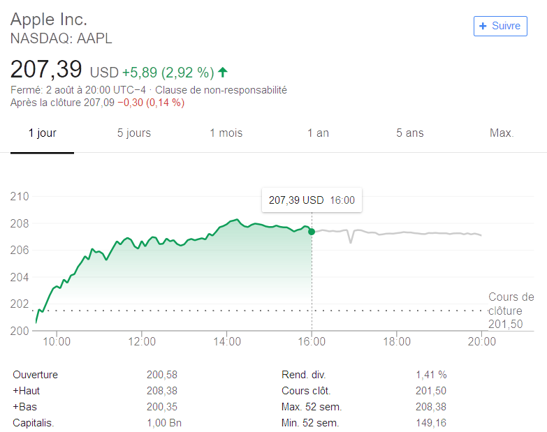 C’est un ordre de grandeur que l’on n’a pas l’habitude de manipuler. Suite à de bons résultats publiés cette semaine sur son deuxième trimestre 2018, Apple devient en effet la première entreprise mondiale à être valorisée plus d’un billion de dollars. Autrement dit, plus de mille milliards. Ses actions s’échangeaient en effet hier à la clôture du NASDAQ à 207,39 dollars, en hausse de près de 3%, soit une valorisation totale de 1 019 milliards de dollars. Une somme colossale pour une société qui n’existait pas il y a cinquante ans.