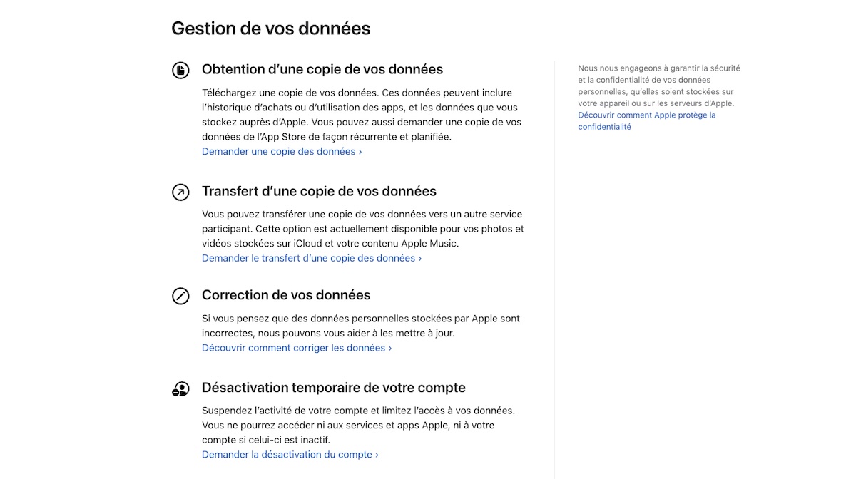 Pour les détenteurs d’appareils Apple, cette opération peut être réalisée sur le portail Privacy, baptisé Données et confidentialité en français, qui permet également de télécharger une copie de ses données ou de désactiver et supprimer son compte Apple.