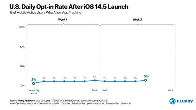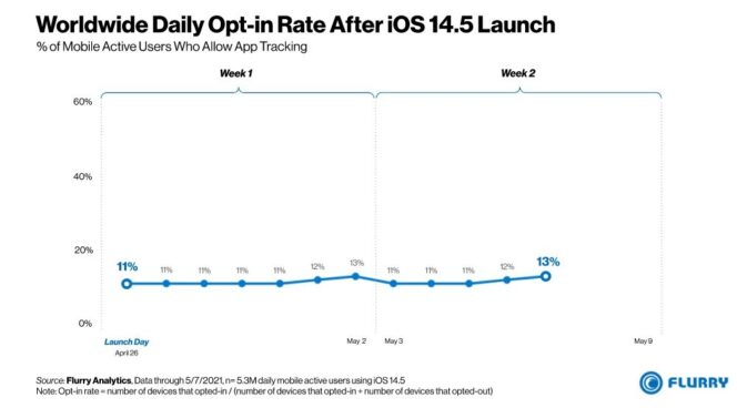 Selon des données rapportées par Flurry Analytics, deux semaines après le déploiement de l’App Tracking Transparency (ATT) par Apple, seulement 13 % des utilisateurs iOS dans le monde, acceptent le suivi publicitaire des applications, contre 11 % au lancement. Une légère augmentation mais qui reste encore faible, ne permettant pas vraiment de rassurer les acteurs du monde publicitaire.