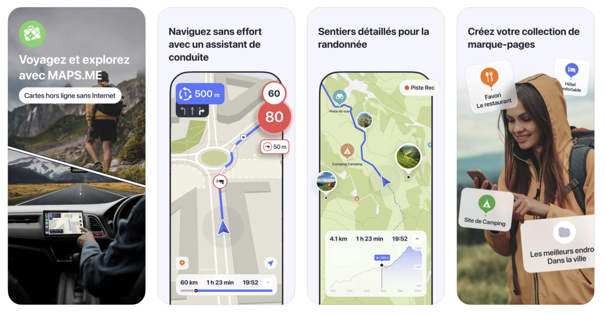 Maps.me est une application qui permet d’accéder à une carte du monde et de pouvoir l’utiliser sans connexion à Internet. En pratique, il vous suffit de télécharger la carte de la zone où vous voyagez en amont, pour pouvoir ensuite naviguer en mode hors connexion. Maps.me indique les restaurants, les points d’intérêt et sites touristiques, les chemins de randonnée, les hôtels, etc. Bien sûr, il est possible de l’utiliser en tant que GPS lorsque vous êtes en voiture, en vélo, à pied, ou encore en transport en commun, et vous pouvez également enregistrer des lieux pour vous y rendre plus tard.