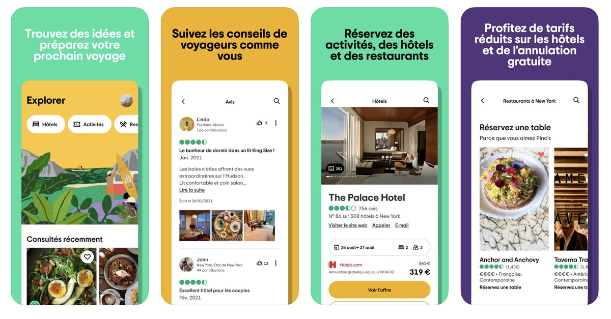 TripAdvisor est une application qui permet de consulter les avis des utilisateurs concernant des restaurants, des hôtels, des sites touristiques ou encore des attractions. Depuis la plateforme, il est aussi possible de réserver une table ou un hébergement. TripAdvisor est une bonne option pour s’assurer de la qualité d’un restaurant ou d’un hôtel avant d’y aller ! N’hésitez pas à jouer le jeu vous aussi, en laissant vous aussi des avis concernant les endroits que vous avez visités.