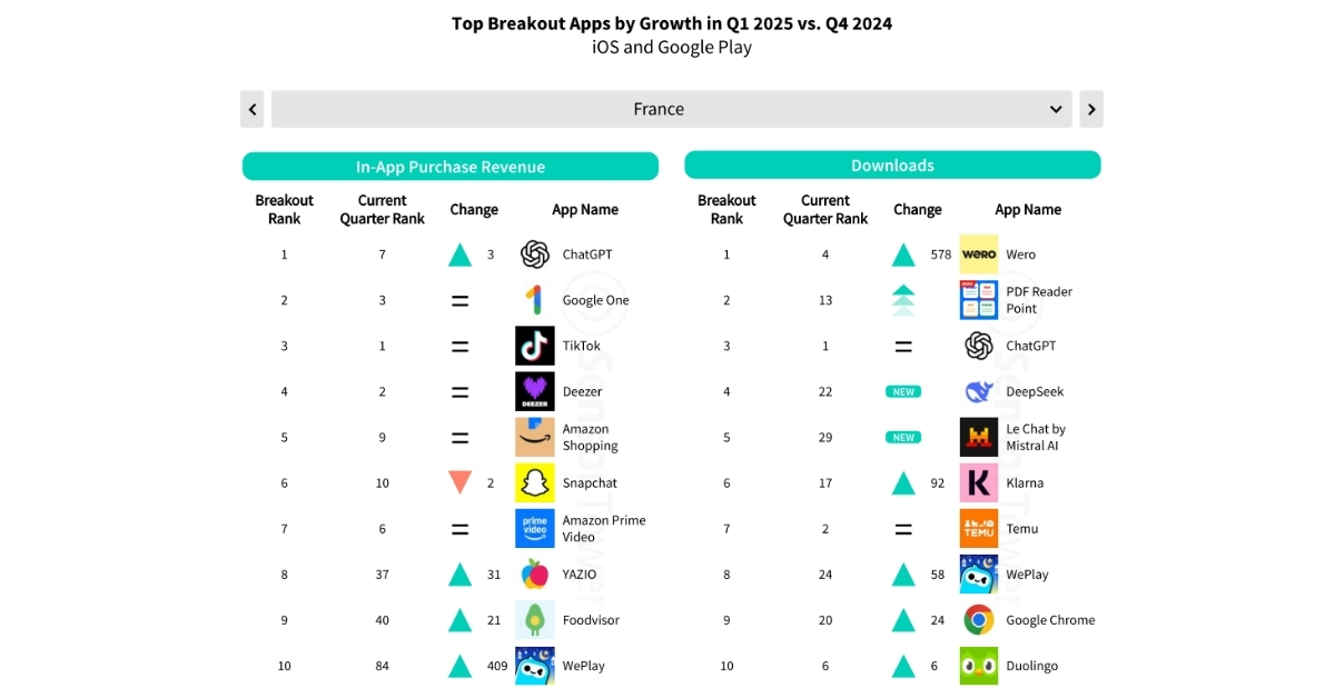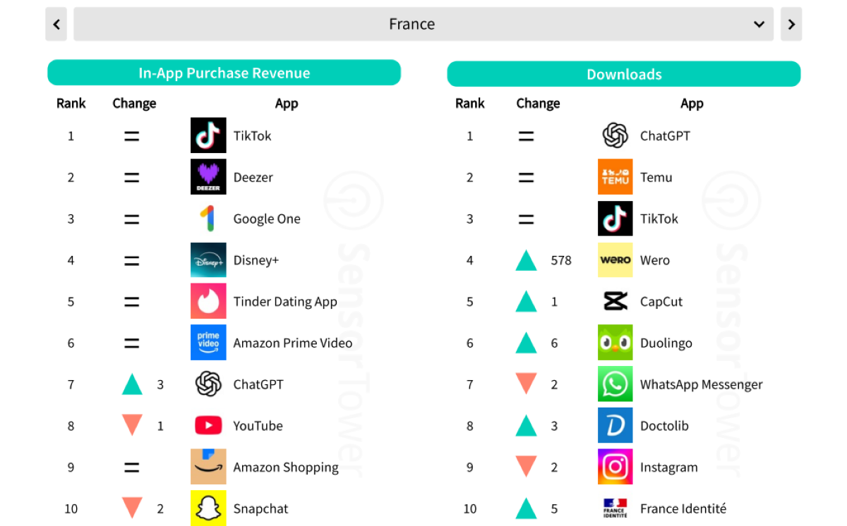 Comme annoncé plus haut, Wero a gagné 578 places par rapport au dernier classement de Sensor Tower, ce qui en fait logiquement l’application avec le plus haut taux de croissance en France. L’app profite de la méforme de Sumeria (anciennement Lydia) pour se faire un nom dans les services de paiement en ligne entre PayPal et Apple Pay. Wero devance PDF Reader Point et ChatGPT. On peut également souligner la présence de deux autres IA génératives dans le top 10 avec DeepSeek (4e) et Le Chat (5e). Enfin, malgré le procès Antitrust à l’encontre de Google et le potentiel démantèlement de Google Chrome, le navigateur web gagne 24 places.