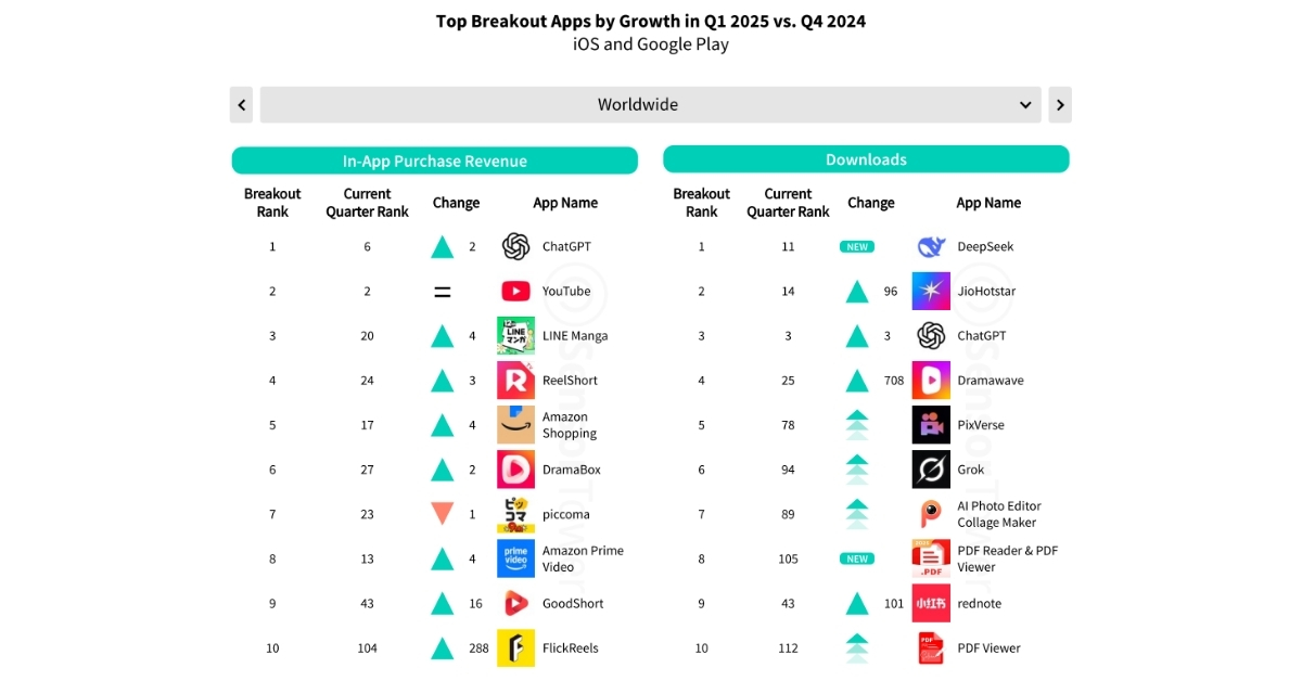 À l’échelle mondiale, DeepSeek se retrouve au pied du top 10 (11e) des applications les plus téléchargées dans le monde, mais est celle qui a connu la plus forte croissance de ce trimestre. Viennent ensuite JioHotstar, une plateforme de vidéo à la demande mise en place par Disney+ pour le marché indien et indonésien, et ChatGPT.