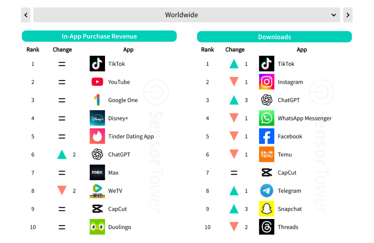 Dans le monde, TikTok récupère sa place de numéro 1 à Instagram, qui est rétrogradé sur la deuxième marche du podium. ChatGPT complète ce trio de tête après avoir gagné 3 places. Deux applications du groupe Meta suivent avec WhatsApp (4e) et Facebook (5e). Ce classement est largement dominé par les réseaux sociaux qui occupent 7 rangs dans ce top 10. ChatGPT, Temu et CapCut sont les seules applications hors social media qui parviennent à intégrer le classement (voir image de une).
