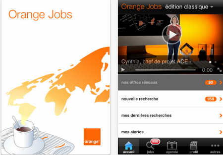 Orange se distingue par ses multiples présences dans la sphère recrutement / marque employeur. L’opérateur téléphonique propose lui aussi une application emploi. L’appli au design très réussi met en avant les postes à pourvoir et propose de nombreuses infos sur le groupe et son recrutement.