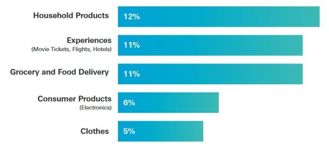 Les consommateurs achètent notamment des éléments pour la maison (12%), des places de cinéma, billets de train ou d’avion (11%) ou encore de la livraison de nourriture (11%).