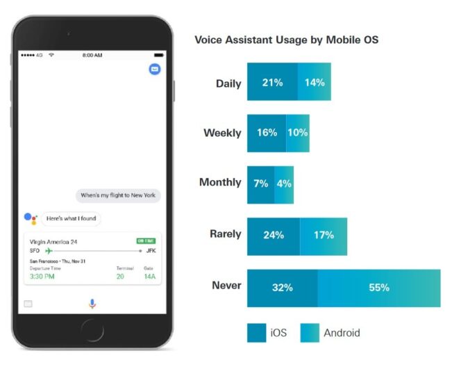 Quand on s’intéresse aux plateformes utilisées on remarque sur smartphone les propriétaires d’iPhone sont plus susceptibles d’utiliser des assistants vocaux que les utilisateurs d’Android. En fait, la majorité des utilisateurs d’Android n’ont jamais utilisé d’assistant vocal. Le fait d’intégrer directement les assistants vocaux au sein des smartphones a favorisé la démocratisation de cette technologie. Aujourd’hui, 49% des personnes interrogées plébiscitent le smartphone pour utiliser les assistants vocaux, l’appareil arrive en tête devant les enceintes connectées (18%) et les ordinateurs (15%).