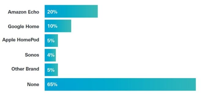 On notera par ailleurs que les enceintes connectées conquièrent de plus en plus de parts de marché. 35% des consommateurs interrogés en possèdent et 1 propriétaire sur 3 déclare utiliser son assistant vocal quotidiennement. Plus de la moitié (55%) l’utilise au moins une fois par semaine. Sur le marché, Amazon et Google restent en tête. 20% des utilisateurs possèdent en effet une enceinte Amazon Echo et 10% possèdent un Google Home.