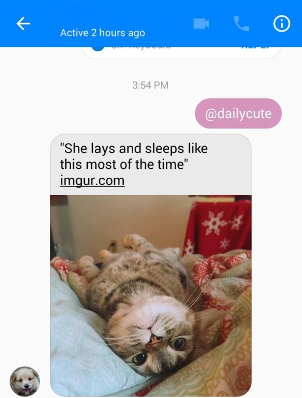 Vous ne savez pas quoi envoyer à votre meilleur(e) ami(e) ou votre chéri(e) de bon matin ? Ne passez plus 3 heures à chercher LA photo la plus mignonne qui fera craquer votre destinataire. Dans l’espace de texte, écrivez « @dailycute » et cliquez sur envoyer. Une image mignonne sera sélectionnée au hasard et envoyée à votre contact ! Rapide, simple et efficace.