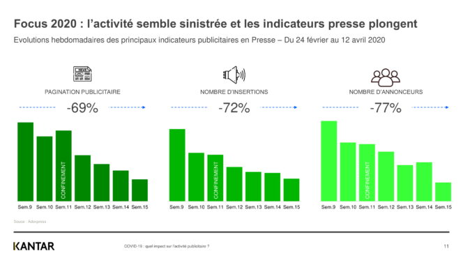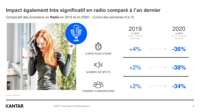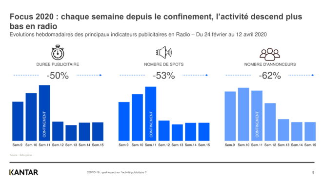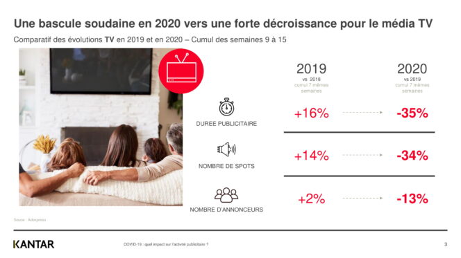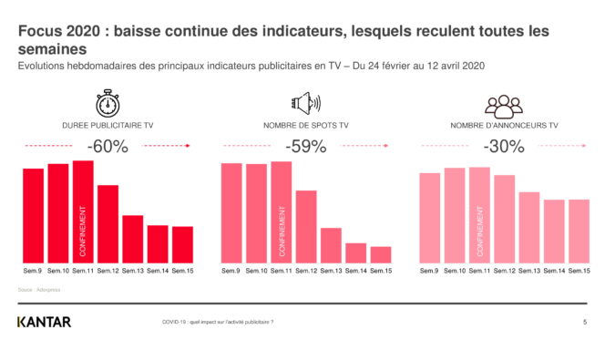 Depuis le début de la crise liée au Covid-19, Kantar, spécialiste des études sur les médias, analysait l’évolution de l’activité publicitaire d’une semaine à l’autre. Une baisse progressive de la publicité sur tous les médias avait déjà été recensée.