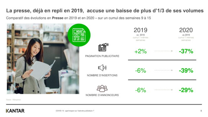 La presse subit une baisse de plus d’1/3 de ses volumes. Le média connaît une diminution de la pagination publicitaire (-37 %), du nombre d’insertions (-39 %) mais également du nombre d’annonceurs (-6 %). L’activité de la presse est en déclin, et continue de baisser au fur et à mesure des semaines.