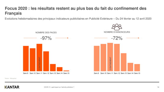 La période de confinement a inévitablement un fort impact négatif sur les publicités extérieures. Les nombres de faces a diminué de moitié et le nombre d’annonceurs a fortement diminué aussi (-34 %). La plus forte baisse concerne le nombre de nouvelles créations de publicités (-66 %). Les principaux indicateurs en publicité extérieure sont en chute libre depuis la première semaine de confinement.
