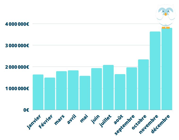 Finalement, la période la plus rentable pour les acteurs du e-commerce reste la fin d’année ; décembre, novembre et octobre étant les mois qui génèrent le plus de chiffre d’affaires. Une statistique qui s’explique notamment par la période de fêtes que représentent ces 3 derniers mois de l’année, avec le Black Friday, Noël et Nouvel An.