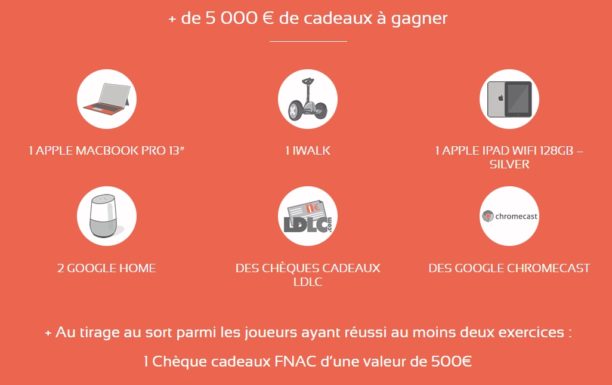 Pour les plus rapides et les meilleurs, de nombreux cadeaux sont en effet à gagner : 1 Mac Book Pro, 1 iWalk, 1 iPad, 2 Google Home, des chèques cadeaux LDLC, des Chromecast… Plus de 5000€ de cadeaux seront distribués aux gagnants. Un tirage au sort permettra aussi à un participant de remporter un Chèque Cadeaux Fnac d’une valeur de 500€.