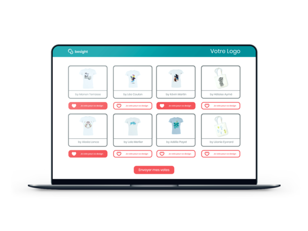Une fois le projet lancé, vous aurez alors accès à une dizaine de propositions qui seront toutes accessibles en ligne. La grosse originalité et plus-value de Besight est que vous pouvez alors demander à votre communauté de voter pour le projet désiré. Ce vote peut être organisé autour d’une communauté de clients, en B2C par exemple ; mais il peut aussi être organisé avec les collaborateurs de l’entreprise afin de les fédérer sur un projet en particulier. C’est par exemple ce qu’a mis en place L’Oréal avec les collaborateurs du groupe appelées à voter sur le logo d’un projet.