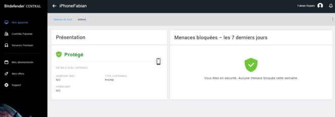 À l’usage Bitdefender se montre facile à prendre en main et s’installe en 2 clics. On apprécie tout particulièrement la légèreté de l’outil. À aucun moment il ne ralentit l’appareil. L’interface en ligne est quant à elle pratique pour gérer les différents devices. La possibilité de contrôler et de bloquer ses appareils à distance est un vrai plus en cas de vol.