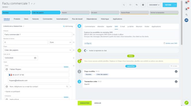 Autre gros point fort de la plateforme : l’implémentation d’un CRM gratuit. Vous pouvez en effet gérer vos contacts, vos factures, vos devis et vos produits depuis l’interface. L’outil est complet et propose une automatisation des actions marketing sur certains contacts.