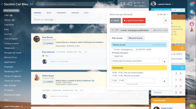 Bitrix propose aussi un système de pointage et de gestion du temps de travail. Vous pouvez calculer les horaires de travail des salariés, créer des rapports de travail, gérer les vacances, etc. Un système d’enregistrement du temps de travail en ligne vous permet d’avoir des rapports de vos équipes sur leurs différentes tâches et le temps dédié.
