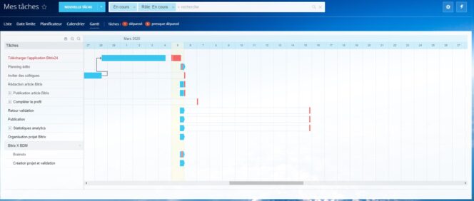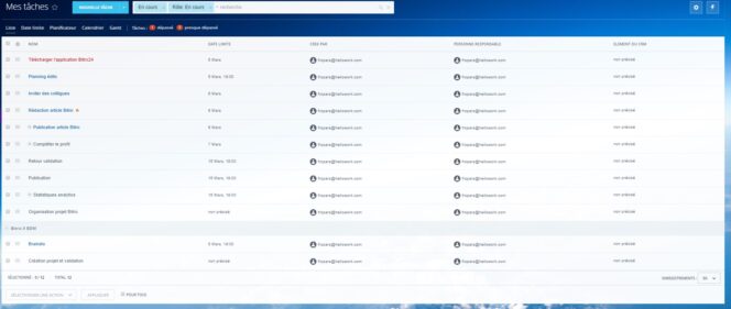 Premier point fort de Bitrix : ses fonctionnalités de gestion de projet et de tâches. L’outil est excellent pour gérer ses projets. Vous pouvez créer autant de tâches, de projets, de sous-projets que vous voulez. On retrouve tout ce qu’on aime sur Trello, avec encore plus de possibilités. Les tâches sont associables à différents membres de l’équipe, et vous pouvez les déléguer. Vous pouvez ajouter des contenus à chaque tâche : liens, images, texte, etc.