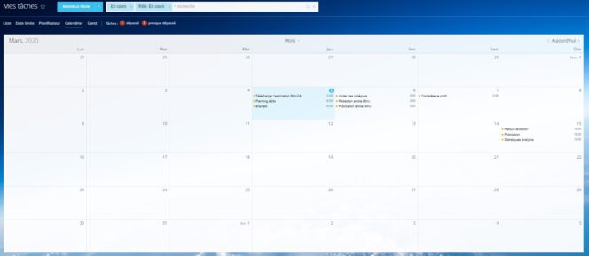 Toutes les tâches sont priorisables et assignables aux différents membres d’une équipe. Les tâches et sous-tâches sont illimitées et assignables à des groupes ou des projets. On apprécie tout particulièrement la possibilité d’afficher les tâches selon ses besoins et ses préférences :