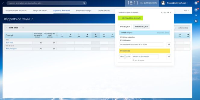 Autre point fort de Bitrix pour suivre les projets : un outil complet de rapports et de gestion du temps. Toutes les tâches réalisées sont consignables, ce qui permet de savoir combien de temps a pris tel ou tel sujet, et donc potentiellement de facturer en proportion. Le pointage obligatoire est configurable, ce qui permet d’indiquer quand, comment et quand se termine une journée de travail. Que ce soit pour monitorer son propre temps, ou celui des équipes, c’est très pratique pour voir ce qui est chronophage sur un projet.