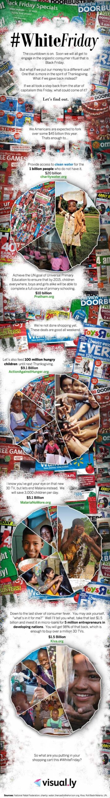 Il y a bien sûr des détracteurs de cette surconsommation. Par opposition au Black friday, on parle alors de White friday. Visually a résumé les aspects financiers de cette journée et les as mis en relief avec ce que l’on pourrait faire de cet argent. Pas moins de 45 milliards de dollars vont être dépensés aux USA aujourd’hui ! C’est assez pour fournir de l’eau potable à un milliard de personnes, de permettre l’éducation pour tous en 2015 (cycle primaire), de nourrir 100 millions d’enfants pendant un an, de sauver 3000 enfants par jour de la Malaria ET de financer 5 millions de micro-entreprises… Prendre du recul vous avez dit ? A noter, la journée mondiale sans achats aura lieu demain. Au vu des dépenses escomptées aujourd’hui, cela devrait plutôt bien fonctionner.