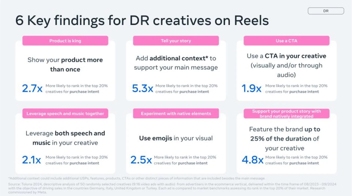 Les DR creatives sont pensées pour déclencher une action mesurable, comme un achat, un ajout au panier, une inscription, une prise de contact, etc. Meta détaille une série de leviers (voir image de une) qui font la différence dans la capacité d’une création à générer cette réponse :