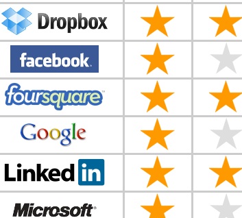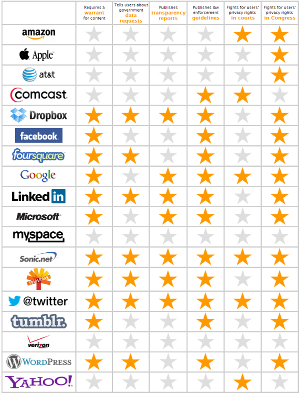 Résultats très disparates avec cependant des évolutions par rapport à l’année dernière. Foursquare, qui n’avait aucune étoile en 2012, en a maintenant 4. De sérieux efforts ont été fait pour un service dont le cœur d’activité est tout de même la localisation de ses utilisateurs. Twitter et Sonic.net (un FAI californien) sont toujours irréprochables selon les critères de l’étude. Google, Dropbox ou encore LinkedIn sont aussi très bien évalués. Facebook, sûrement le plus regardé sur ses politiques concernant les données de ses utilisateurs, a encore à faire sur ce terrain, notamment sur la clarté de ses conditions d’utilisation.