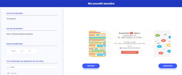 La création de bannière se fait en quelques clics : il suffit d’uploader une photo en format horizontal, d’ajouter un nom de bannière, un lien vers lequel renvoyer le trafic et les dates de publication. Une fois l’adresse mail liée à une signature préalablement crée, c’est terminé. Le tout prend à peine 2 ou 3 minutes.