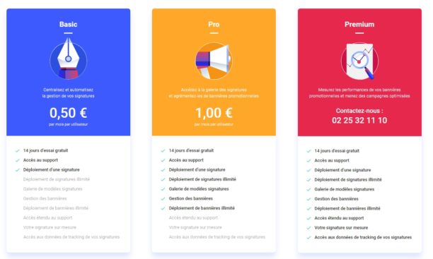 Au niveau des tarifs, Boost My Mail est une solution peu onéreuse. Plusieurs pricing sont disponibles. L’offre la moins chère commence à 0,50€ par mois et par utilisateur et permet la centralisation et la gestion des signatures. Pour 1€ par utilisateur et par mois, vous avez accès à déploiement de signatures illimité, à une galerie de modèles de signatures, à la gestion des bannières et au déploiement illimité de bannières. Pour avoir accès au tracking des signatures, vous devrez passer par un plan sur-mesure.