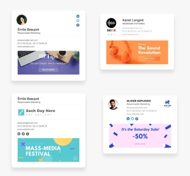 - En fin de cycle de vente : la signature mail proposera un contenu qui a vocation à fidéliser le client ou à provoquer le bouche à oreille : vidéo à partager, lien vers une offre de parrainage…