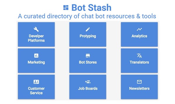 Dernier né des répertoires d’outils relatifs aux bots : Bot Stash. Ce site référence et organise toutes les ressources et les outils qui aident les développeurs de chatbot à créer le leur , selon leur domaine d’activité (18 catégories au total) et l’usage qu’ils souhaitent en faire : marketing, analytics, traducteurs, newsletters, magazines, frameworks… L’univers des bots évolue très rapidement et de nombreux produits sont lancés chaque semaine, c’est pourquoi Bot Stash est intéressant puisqu’il permet de garder une trace de toutes les ressources pertinentes liées aux bots.
