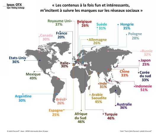Les résultats diffèrent selon les pays : le Mexique, l’Afrique du Sud, le Turquie ou encore l’Indonésie dépassent les 40%, avec plus de la moitié pour le dernier cité (51%). En Europe, le brand content ne fait pas l’unanimité avec globalement moins de 30% des répondants le citant comme critère pour suivre une marque sur les réseaux sociaux. La France, avec 20%, est la dernière roue du carrosse. Comment expliquer cela ? La conjoncture actuelle ? Une différence radicale de mentalité ? Il faudra ici une autre étude pour en comprendre les raisons profondes.