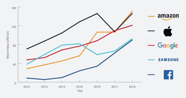 En 2017, Amazon est passé de la troisième à la première place du classement des marques les plus valorisées, au détriment d’Apple et Google.