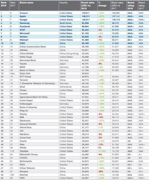 Chaque année, Brand Finance publie le classement des 500 marques les plus valorisées au monde. En 2016, le top 5 était constitué de Google, Apple, Amazon, AT&T et Microsoft. Cette année, Amazon passe à la première place grâce à une hausse de 42% de sa valorisation. Google aussi a vu sa valorisation augmenter (de 10%), mais Apple a fait mieux (+37%) et dépasse désormais la firme de Mountain View. À noter les bonnes performances de Samsung et Facebook, qui prennent les quatrième et cinquième places du classement devant AT&T et Microsoft.