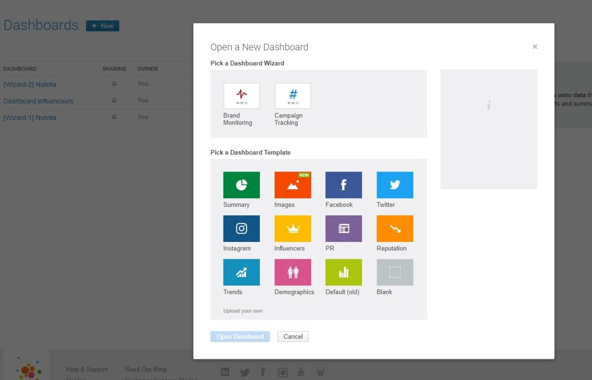 Lors de la création de votre Dashboard, vous avez plusieurs choix. Deux assistants « Brand Monitoring » et « Campaign Tracking » vous guideront pas à pas dans la création de votre Dashboard.