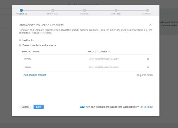 Vous pourrez notamment choisir d’analyser plusieurs produits lors de votre veille sur votre marque (ou votre veille sur vos concurrents). Vous pouvez aussi choisir d’analyser ce qui se dit sur des personnes ou personnalités proches de la marque : CEO, ambassadeur, porte-parole…
