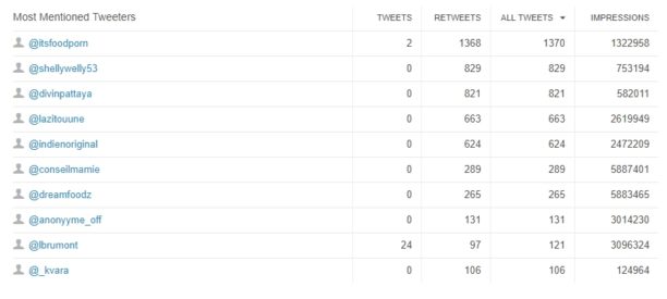 Les Twittos les plus influents sur le sujet Nutella sont eux aussi identifiés, et là encore tout est cliquable, on accède au compte choisi en 1 clic.