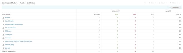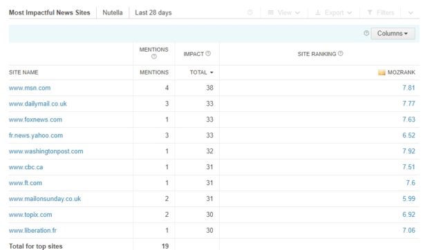 Autre fonctionnalité très pratique de Brandwatch : la veille média. L’outil relève les articles publiés par les sites de presse sur votre marque. Dans le cas de l’affaire Nutella, cela permet de se rendre compte que l’histoire a été couverte par le Dailymail, FoxNews, Libé ou le Washington Post. Comme pour les autres datas, les résultats sont cliquables et vous redirigent vers l’article mentionné.