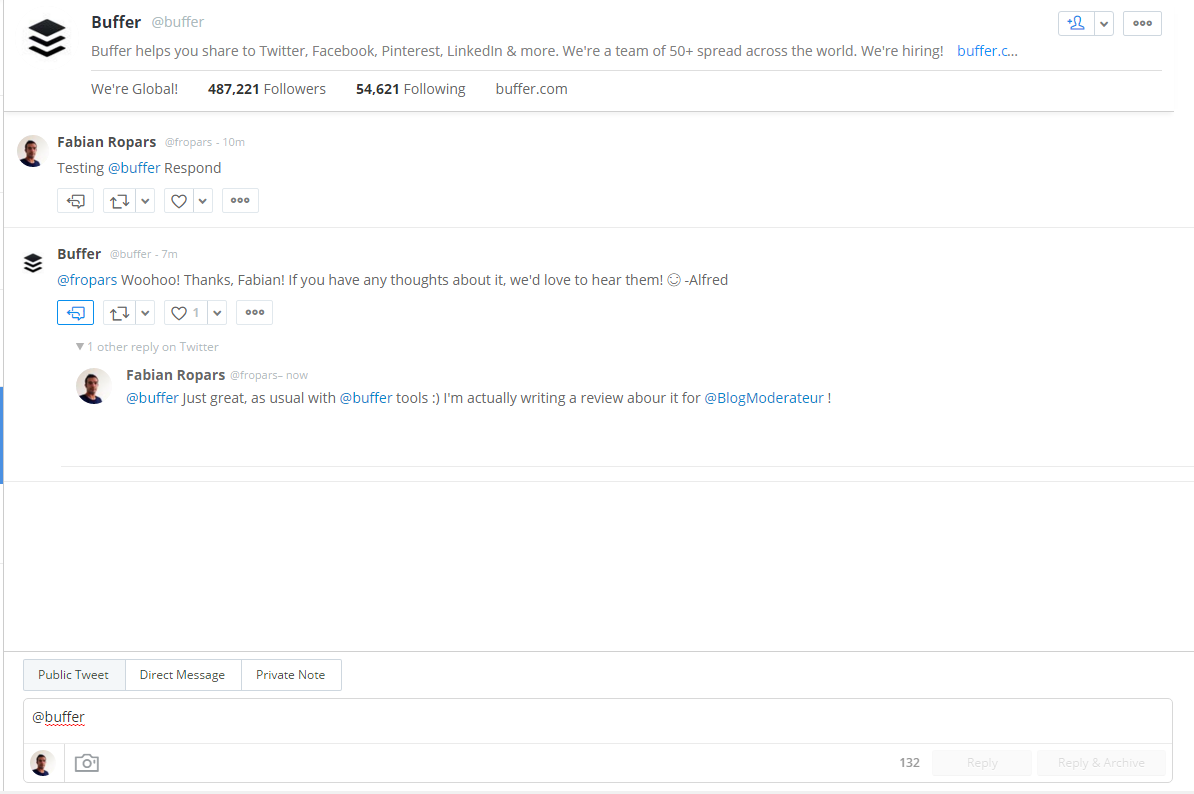 Pour le coup, ils ont « juste » racheté respond.ly, qui était à mes yeux le meilleur outil sur le marché pour résoudre ce problème. Pour l’instant l’intégration de Buffer est essentiellement cosmétique, le service est strictement identique à ce que proposait Respondly avant le rachat par Buffer.