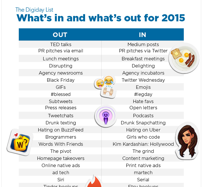 Chaque fin d’année est synonyme d’analyses sur les « tendances » de l’année à venir. Très souvent dictées par des spécialistes auto-proclamés d’Internet, ces analyses ont un intérêt très limité. L’excellent site digiday vient de publier un récapitulatif des tendances 2015. C’est évidemment un tableau ironique qui reprend les analyses tendancielles « bullshit » et les synthétise. Cette année, les Posts medium remplaceront les TedX, les Emojis remplaceront les Gifs, et les « hate favs » les « subtweets ». Si détester BuzzFeed était très tendance en 2014, cette année il faudra détester Uber. Les imprimantes 3D laisseront définitivement la place aux drones, le SEO laissera sa place aux social url. Certaines analyses sont assez proches de la réalité, d’autres au contraire ressemblent fort aux déclarations vides de sens de certains « social media gurus », ou autres « digital real time content expert ». L’analyse de Digiday est en tout cas particulièrement bien vue et nous rappelle à quel point les analyses des tendances à venir sont douteuses. Vous pouvez retrouver toutes les tendances 2015 et les buzzwords 2014 qu’elles remplaceront dans ce tableau :