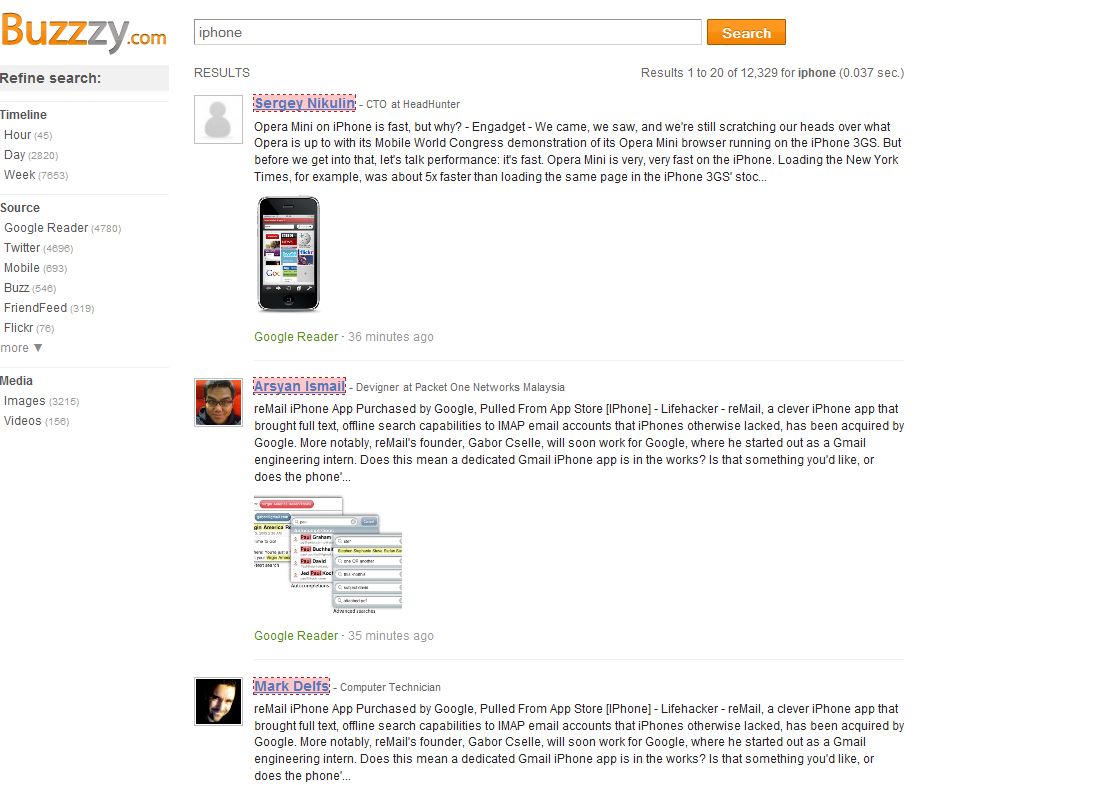 Il fallait bien que çà arrive. La percée de Twitter s’est accompagnée de multitudes de moteurs de recherches spécialisés pour vous fournir le meilleur des tweets. Si Google Buzz n’a pas pour le moment atteint les sommets escomptés (pas sûr qu’il le fasse), les services dérivés commencent déjà à arriver. Les moteurs de recherche en temps réel étaient déjà bien en vogue, en voici un consacré à Google Buzz. Il est en version alpha, au tout début de son développement, soyez donc indulgent ! Entrez les mots clés de votre choix, le site vous ressortira les buzzs les plus marquants ainsi que leur auteur.