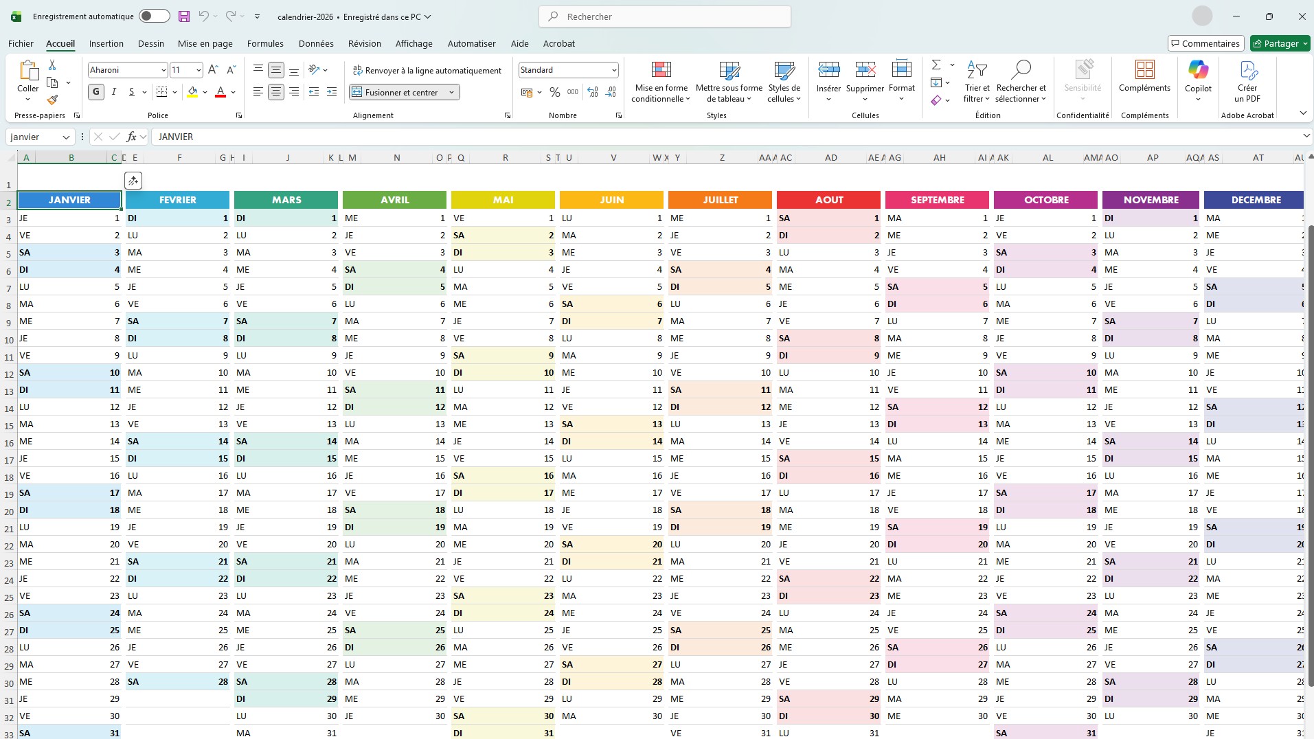 Calendrier Excel 2026 à imprimer ou à télécharger