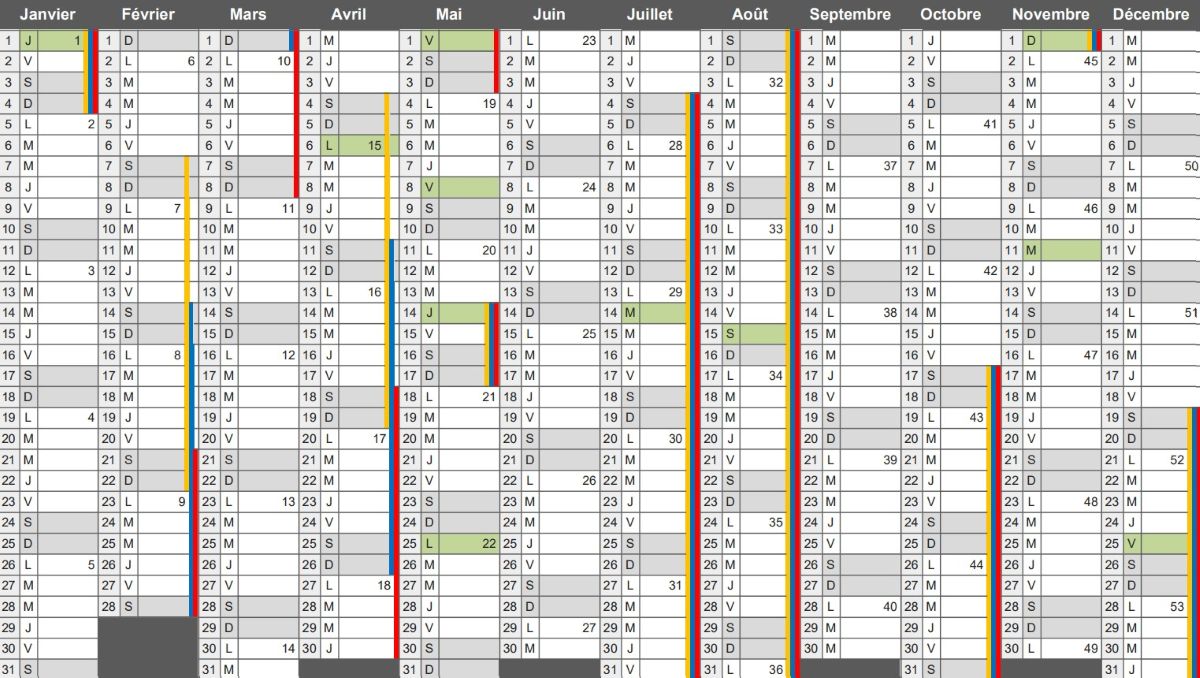 Excel-Pratique propose un calendrier standard disponible en téléchargement gratuit au format .xlsx. Cette ressource fonctionne avec l’ensemble des versions d’Excel, LibreOffice et OpenOffice Calc. Une fois importé dans votre logiciel de bureautique, ce fichier est entièrement modifiable pour s’adapter à vos attentes.