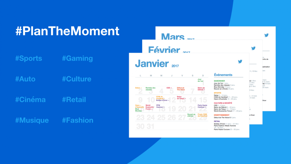 EDIT : Une version précédente de cet article mentionnait un outil en ligne interactif, conçu l’an dernier par Twitter. Il ne sera pas proposé cette année. Le réseau social nous indique que le format PDF a été privilégié pour le calendrier 2017. Vous devrez donc télécharger le calendrier marketing 2017 #PlanTheMoment, le sauvegarder sur votre ordinateur, l’imprimer ou conserver cette page dans vos favoris pour accéder facilement à tous les événements prévus cette année.